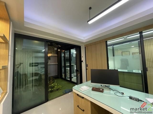 ชั้นล่าง : พื้นที่ office และ 2 executive office rooms, open space meeting room , 2 ห้องน้ำ, kitchen and courtyard. ชั้นบน 3 ห้องนอน, 1 ห้องน้ำ.