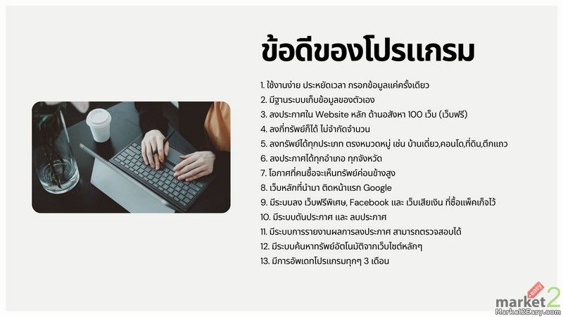 โปรแกรมเราดีอย่างไร ? 1 ใช้งานง่าย ประหยัดเวลา กรอกข้อมูลแค่ครั้งเดียว 2 ลงทรัพย์ใน Website หลัก ด้านอสังหา 100 Web 3 มีฐานระบบเก็บข้อมูลของตัวเอง 4 โอกาศที่คนซื้อจะเห็นทรัพย์ค่อนข้างสูง 5 เว็บหลักที่นำมา ติดหน้าแรก Google
