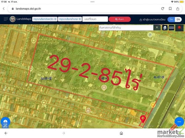 ขายถูกที่ดินดอนเมือง 29-2-85 ไร่ (11,885 ตรว.) ตรงข้ามสนามบินดอนเมืองเพียง 500 เมตร และ ใกล้รถไฟฟ้าสายสีแดง สถานีดอนเมือง เพียง 650 เมตร ที่ดินแปลงนี้อยู่ในย่านความเจริญของดอนเมือง เหมาะสำหรับพัฒนาทำโครงการหมู่บ้านจัดสรร คอนโดมิเนียม โฮมออฟฟิศ โรงแรม เซอร์วิสอพาร์ทเม้นท์ ดอนเมือง กรุงเทพฯ