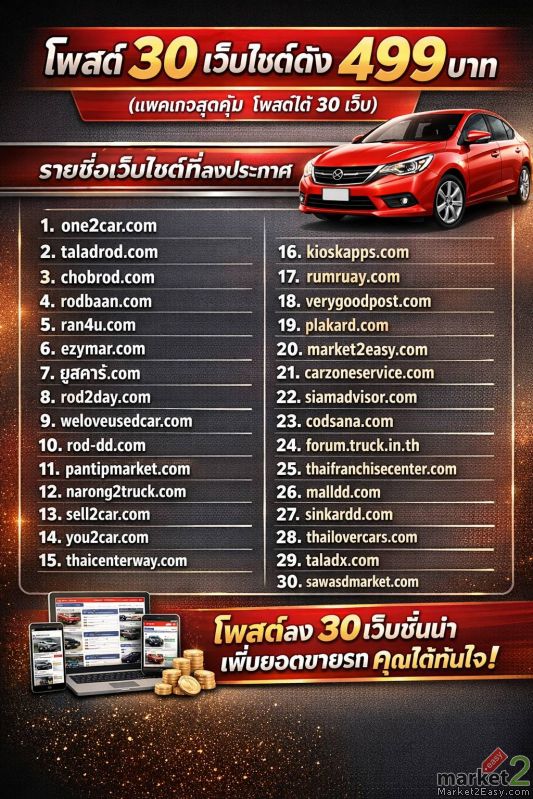 แพ็กเกจ A 499 บาท • โพสต์ 30 เว็บรถชั้นนำ เช่น one2car, chobrod, taladrod เหมาะกับผู้ต้องการขายรถ งบจำกัด