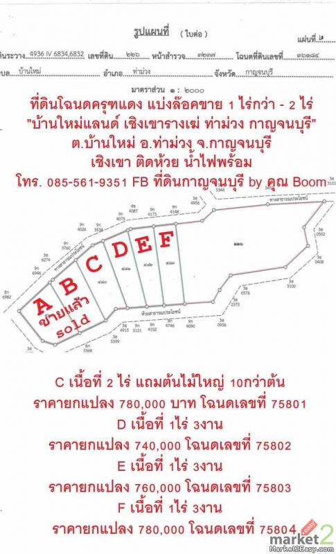-แปลง C เนื้อที่ 2 ไร่ แถมต้นไม้ใหญ่ 10กว่าต้น (สัก เหลืองปรีดียาทร ขี้เหล็ก) ราคายกแปลง 780,000 บาท โฉนดเลขที่ 75801 -แปลง D เนื้อที่ 1ไร่ 3งาน ราคายกแปลง 740,000 โฉนดเลขที่ 75802 -แปลง E เนื้อที่ 1ไร่ 3งาน ราคายกแปลง 760,000 โฉนดเลขที่ 75803 -แปลง F เนื้อที่ 1ไร่ 3งาน ราคายกแปลง 780,000 โฉนดเลขที่ 75804