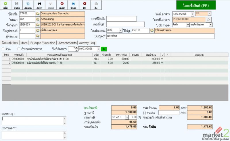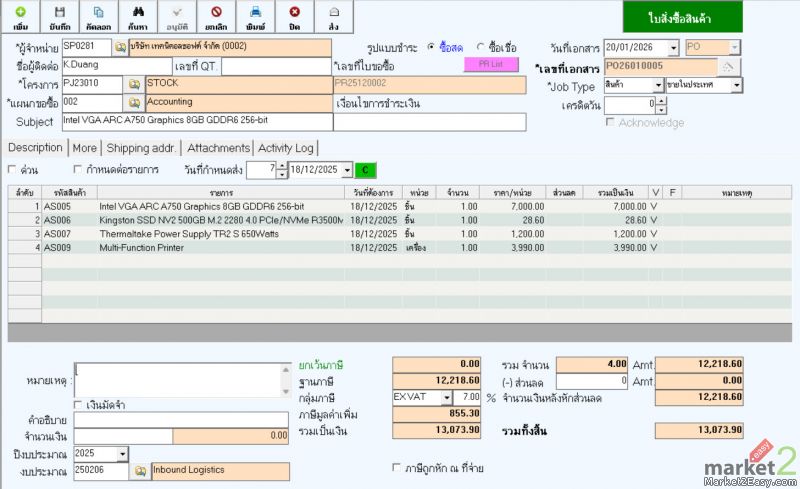 3. ในการออกใบสั่งซื้อสามารถออกได้ 2 แบบคือ อ้างอิง ใบขอซื้อ กับเปิดโดยไม่อ้างอิงใบขอซื้อ (แล้วแต่นโยบายบริษัทฯ)