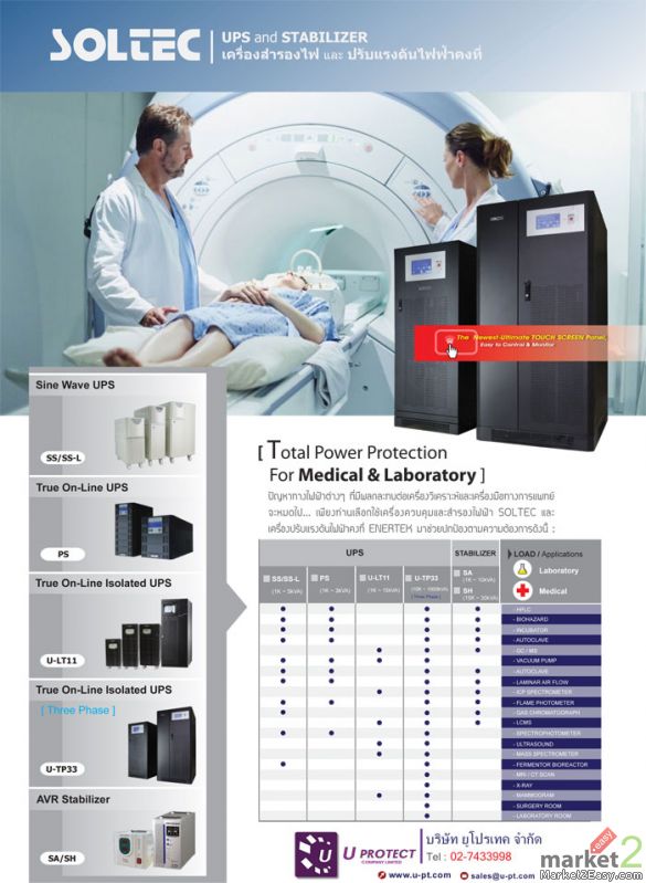 บริษัทยูโปรเทคจำกัดเป็นผู้นำเข้า-จัดจำหน่ายระบบป้องกันปัญหาไฟฟ้าครบวงจร ภายใต้ BRAND : SOLTEC , PROTEK , ENERTEK ใคร่ขอเสนอเครื่องสำรองไฟฟ้า UPS และเครื่องปรับแรงดันไฟฟ้าคงที่ STABILIZER ที่ออกแบบใช้งานกับเครื่องมือวิทยาศาสตร์ในห้องแล็ปและเครื่องมือทางการแพทย์โดยเฉพาะ