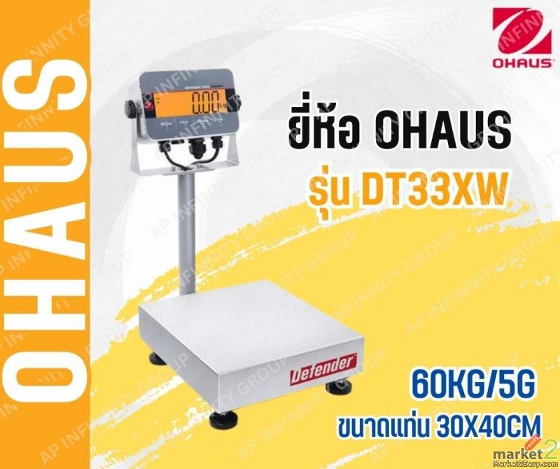 เครื่องชั่งดิจิตอลตั้งพื้นแบบกันน้ำ 60Kg เครื่องชั่งดิจิอล 60Kg ตาชั่งดิจิตอล เครื่องชั่งดิจิตอลวางพื้น เครื่องชั่งดิจิตอลแบบวางพื้นกันน้ำ พิกัด 60Kg อ่านค่าความละเอียด 5g (0.005Kg) ขนาดแท่นชั่ง 30x40mm. ยี่ห้อ OHAUS รุ่น DT33XW