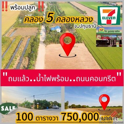 ที่ดินถมแล้ว ติดคอนกรีต มีท่อระบายน้ำ คลอง 5 คลองหลวง น้ำไฟหน้าแปลง 100ตรว.7.5แสน฿ T.o86-3ol-6l6l