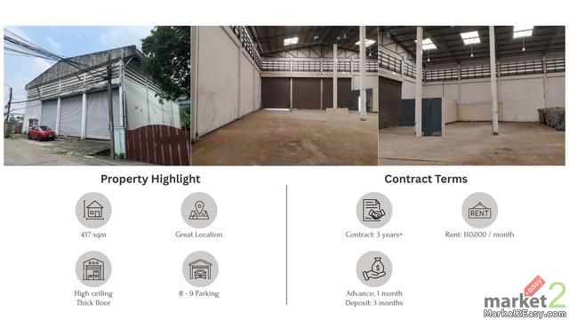 - พื้นที่อาคาร 437 ตร.ม. - หลังคาสูง 10 ม. ( ทำชั้นลอยเพิ่มได้ ) - เพดานสูง เหมาะสำหรับธุรกิจที่ต้องการพื้นที่โปร่งหรือเพิ่มชั้นลอย - พื้นหนา รับน้ำหนักได้สูง แข็งแรงเหมาะสำหรับการใช้งานเชิงพาณิชย์