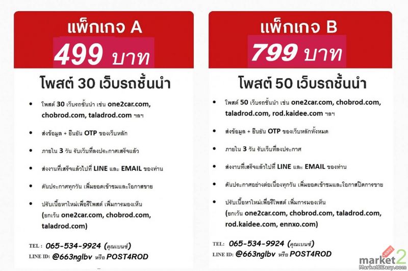 แพ็กเกจ A 499 บาท • โพสต์ 30 เว็บรถชั้นนำ เช่น one2car, chobrod, taladrod เหมาะกับผู้ต้องการขายรถ งบจำกัด